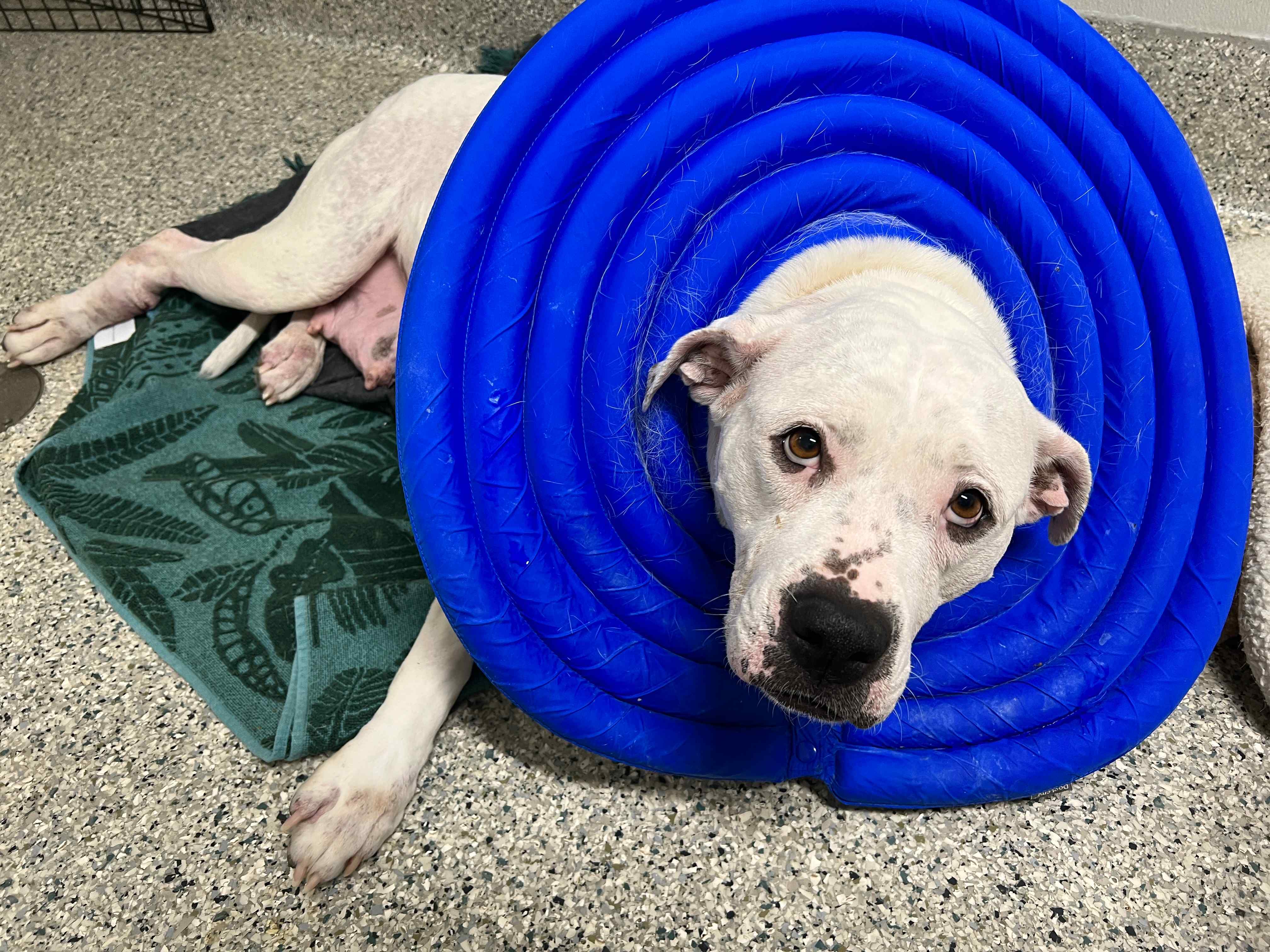 Ladybug, a sweet 5-year-old American bulldog mix, who came to the OHS scared, expecting a baby, and in pain from a terrible growth that made every step a struggle. Because of your kindness, we were able to give her a safe place to rest, welcome her baby, Baby Bug, and provide the surgery she desperately needed. Today, both Ladybug and Baby Bug are happy, healthy, and full of hope — all thanks to you!